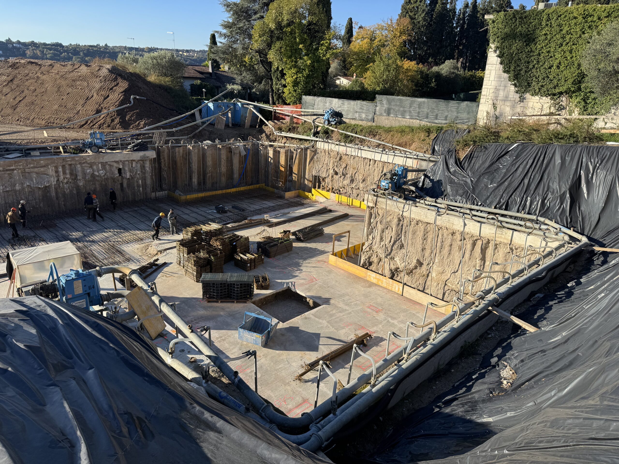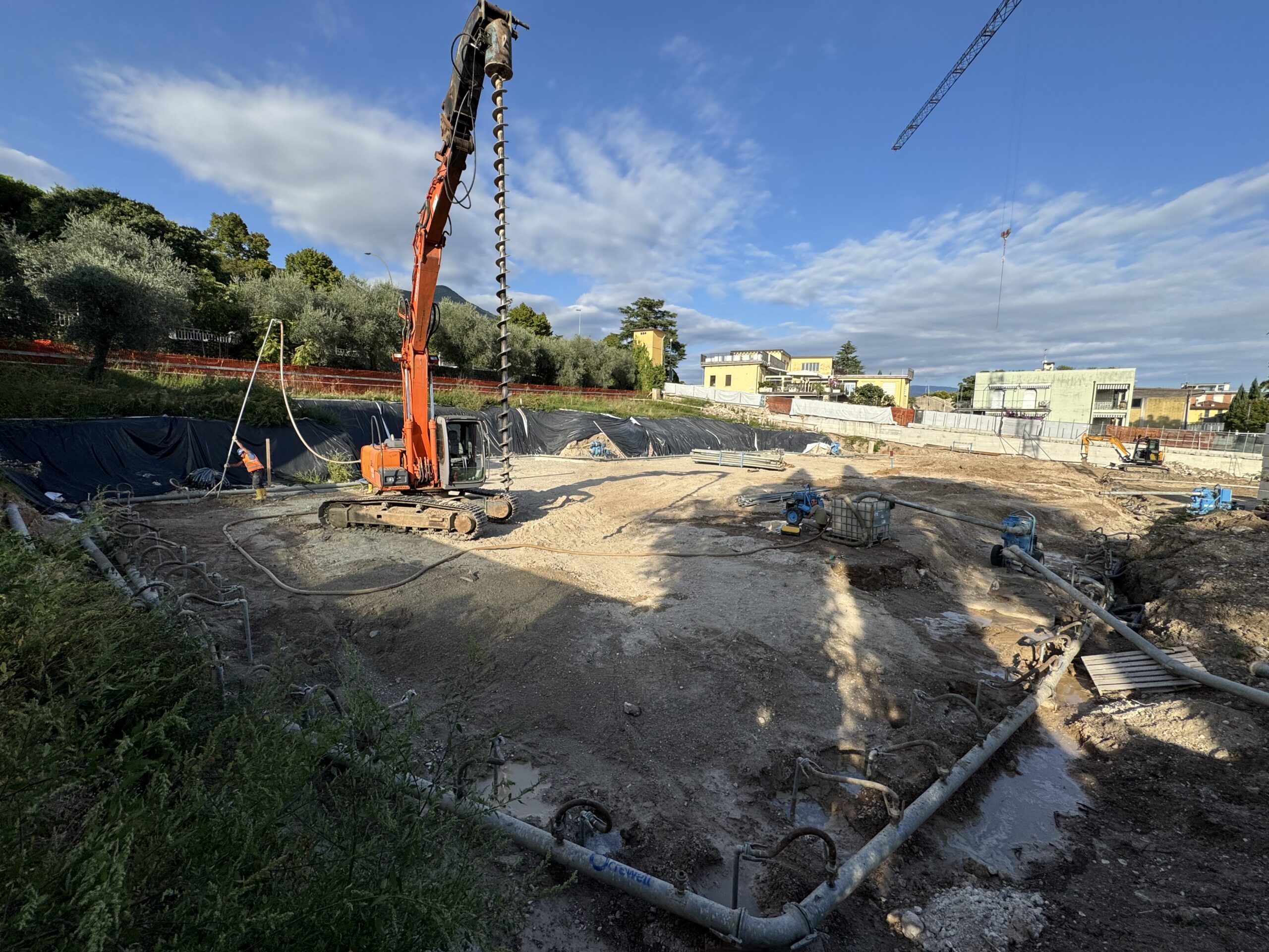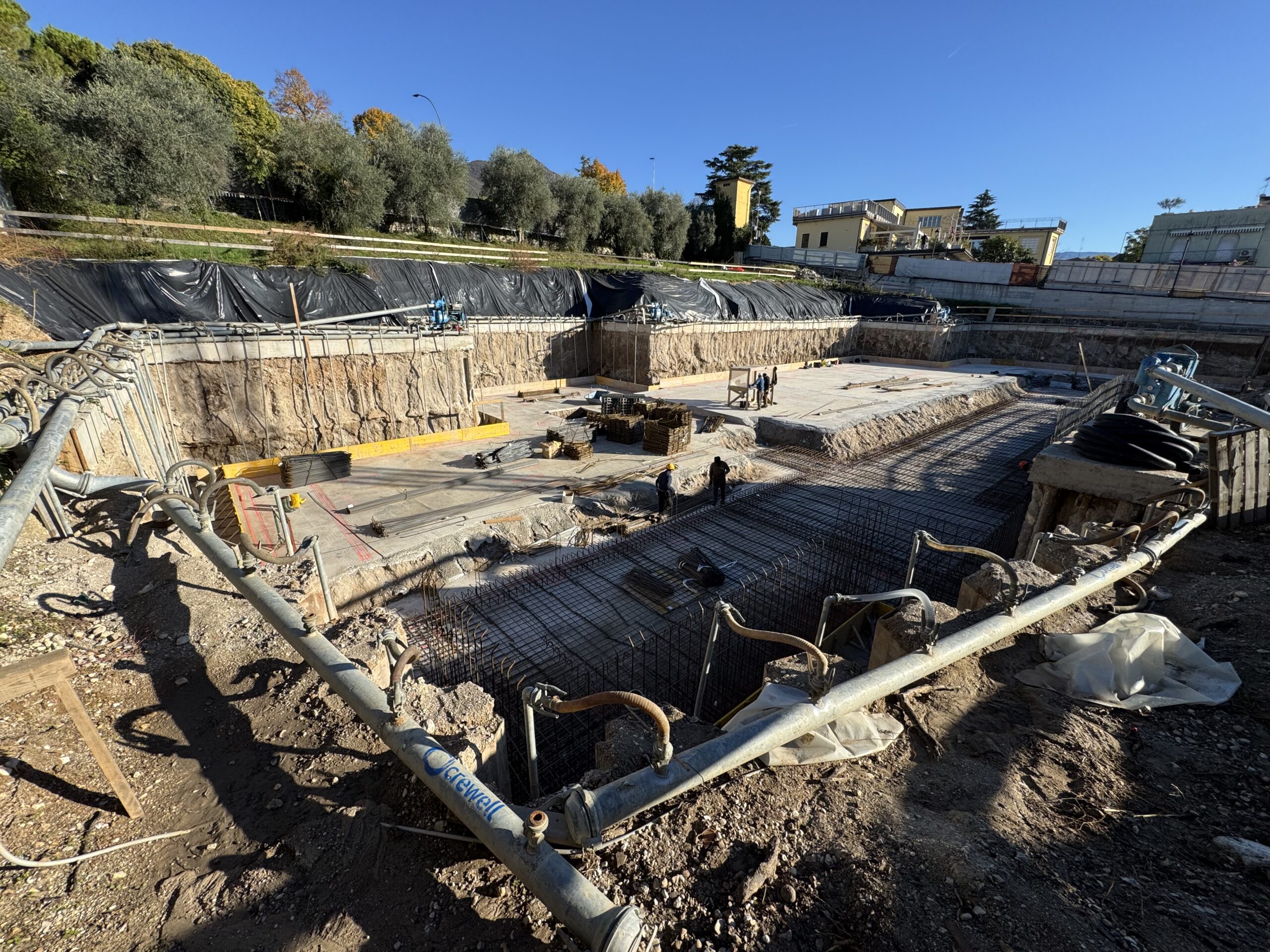 Crewell Srl ha progettato e realizzato un sistema di drenaggio perimetrale wellpoint, dimensionato per garantire il controllo continuo della falda durante tutte le fasi di scavo.
